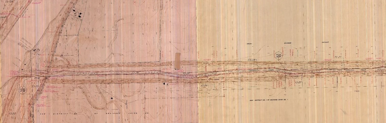 Anglo settlement along Copperas Creek began in the 1830s. Settlers farmed the floodplain without drainage or flood management until 1905 when, “the mouth of Copperas Creek … filled up (with sediment), and the backwater during heavy rains flooded the adjacent land” (63d US Congress, 2d Session, Vol. 22. 1914. p. 44). In December 1905, farmers along the creek formed the Drainage Union District No. 1 (south of Copperas Creek) and the Drury Drainage District (north of Copperas Creek). Copperas Creek was straightened from the point where the creek emerged from the hills to its outlet in the Mississippi near Blanchard Island. The channelized creek - now a ditch - had a 40 foot base. The Corps and Districts kept the channel in line with levees and routine sediment dredging. They constructed levees along the Mississippi above the Copperas Creek floodline and three feet above the high water mark of 1892 - the flood year on which the Corps of Engineers standardized all of their plans.